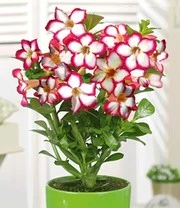Hoe zonniger en lichter de woestijnroos Noble Concubine staat, hoe eerder ontwikkelen zich van mei tot de herfst prachtige bloemen. Naarmate de plant ouder wordt, bloeit hij maandenlang. De verzorging en de behoefte aan water is gering. Er mag alleen water worden gegeven, als de grond in de pot al droog is. Afhankelijk van het seizoen worden de planten met of zonder bloemen geleverd. (Adenium obesum)